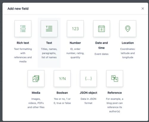 contentful field というのは、contentful で利用されている入力項目の種類のことです。 こちらでマークダウン形式で入力できるようにフィールドを追加していきます。 手順 1 Add field ボタンでフィールドを追加 2 フィールドの種類は「text」を選択 (「Ric…